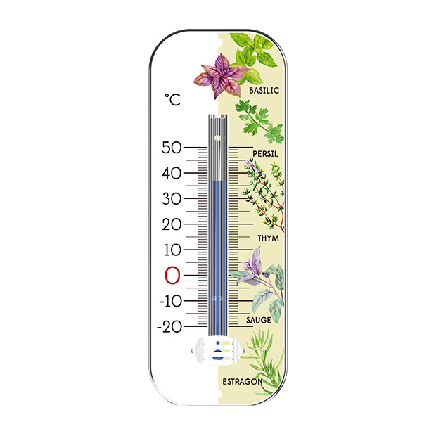Compacto y elegante, este termómetro de 19 cm de metal con diseño de hierbas aromáticas es la solución ideal para controlar la temperatura ambiental interior y exterior.